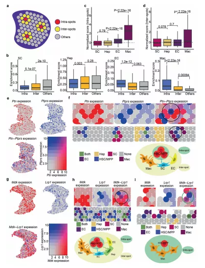 a點內、點間及其他的示意圖。點內:HSC/MPP 定位點;點間:HSC/MPP 包圍點;其他,其他遠端的點。b箱線圖展示點內、點間和其他點中生態(tài)位細胞的富集分數。c箱線圖展示了點內生態(tài)位細胞的歸一化(富集)評分。d箱線圖顯示點間生態(tài)位細胞的歸一化(富集)評分。e FL中Ptn和Ptprs 的共表達模式。f 空間特征圖展示Ptn-Ptprs豐富的 HSC/MPP 擴增單元?;騊tn在生態(tài)位細胞定位點(頂部,紅色點)和基因Ptprs在HSC/MPP 定位點(頂部,藍色點)的表達模式。g FL中Mdk和Lrp1 的共表達模式。h富含Mdk -Lrp1 的HSC/MPP 擴增單元(點間)的空間特征圖。i空間特征圖展示富含Mdk- Lrp1 的HSC/MPP 擴增單元(點內)。