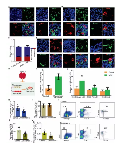 a免疫熒光分析顯示 E14.5 FL 冷凍切片中 F4/80(代表巨噬細胞)和 c-Kit(代表 HSCs/MPPs)的表達。b免疫熒光分析顯示 E14.5 FL 冷凍切片中 F4/80(代表巨噬細胞)和 Runx1(代表 HSCs/MPPs)的表達。C柱狀圖展示有和無細胞相互作用的 HSCs/MPPs 的比例。d免疫熒光分析顯示 E14.5 FL 冷凍切片中 F4/80(代表巨噬細胞)、CD150(代表 HSCs/MPPs)、Mecom(代表 HSCs/MPPs)和 Hlf(代表 HSCs/MPPs)的表達。f源自巨噬細胞和 HSC/MPP 共培養(yǎng)系統(tǒng)的 HSCs/MPPs(LSK 細胞)的數量。g源自MDK補充培養(yǎng)物的 100 個 HSCs/MPPs(LSK、Flt3 -LSK 和 SLAM-LSK 細胞)的HSCs/MPPs(LSK 細胞)的數量。h氯膦酸鹽-脂質體和對照-脂質體處理后 E14.5 FL 中的總細胞數。i氯膦酸鹽處理前后 E14.5 FL中譜系- (Lin- ) 細胞的比例。j氯膦酸鹽處理前后 E14.5 FL 中 LSK 細胞的比例。k氯膦酸鹽處理前后 E14.5 FL 中 SLAM-LSK 細胞的比例。l流式細胞儀分析顯示E14.5 FL在氯膦酸鹽處理前后Lin -,LSK,SLAM-LSK的細胞比例。