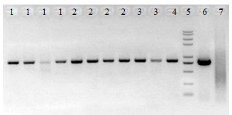 圖3:提取小鼠微量(~5 mg)精子,將提取的DNA進(jìn)行PCR擴(kuò)增,擴(kuò)增產(chǎn)物進(jìn)行跑膠,瓊脂糖濃度為1%,70 V電壓,跑膠45 min。1:小鼠1精子;2:小鼠2精子;3:小鼠3精子4:小鼠4精子;5:DL2000 Marker;6:陽(yáng)性對(duì)照DNA(825bp);7:陰性對(duì)照。