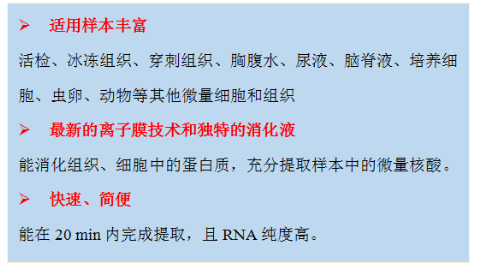 總之,從微量細(xì)胞、組織樣本中提取的RNA,具有較高的濃度和純度,且良好的完整性。可以直接應(yīng)用于Northern 雜交、RT-PCR、qPCR、體外翻譯等各種常規(guī)分子生物學(xué)實(shí)驗(yàn)。