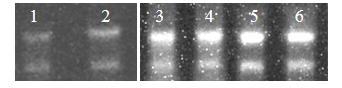 圖4:將提取的RNA每孔上樣200 ng,瓊脂糖濃度為1%,180V電壓,跑膠20 min。Lane 1:小鼠胃;Lane 2:小鼠子宮;Lane 3:石斑魚(yú);Lane 4:東亞飛蝗;Lane 5:白條地藤壺;Lane 6:梨小食心蟲(chóng)。