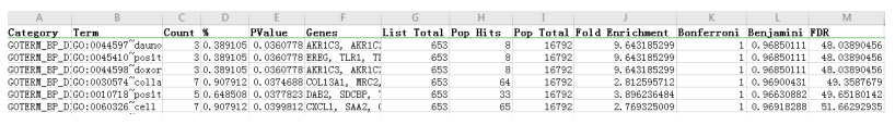 DAVID是一款免費的在線分析軟件,我們只需要準備一列基因名(gene list)。下載其結(jié)果,如下圖所示: