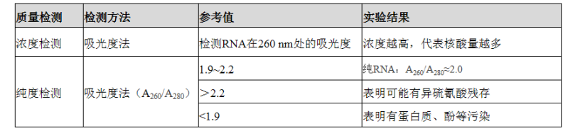 由于RNA具有共軛結(jié)構(gòu),可以吸收紫外光,故測定RNA溶液在260 nm的吸光度值,可計算出RNA的含量。其中純度高的RNA,A260/A280比值應在1.9~2.2之間,若比值>2.2,表明可能有異硫氰酸,若比值<1.9,表明有蛋白質(zhì)、酚等污染;建議重新提取RNA。