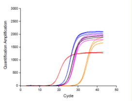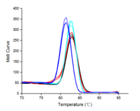 圖7:以1?μg不同物種的RNA為模板(紅色:人肝癌細胞;藍色:雞;黑色:斑馬魚;紫色:水稻種子;黃色:番茄果),用BiomarkerScript Ⅱ 1st Strand cDNA Synthesis Kit進行逆轉(zhuǎn)錄,得到cDNA產(chǎn)物。再以100 ng不同物種的?cDNA為模板,用Biomarker?2×SYBR Green Fast qPCR Mix進行qPCR擴增。