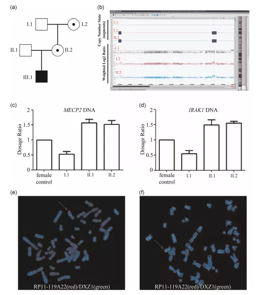 使用SNP微陣列檢測I.1、I.2和II.2的變化。在II.2和I.2(圖1b)中,在Xq28區(qū)域和Xq27.3區(qū)域分別顯示了437KB的重復(fù)和284KB的重復(fù),這表明Xq28和Xq27.3重復(fù)是母系遺傳的。Xq28區(qū)域包含13個在線孟德爾人遺傳(OMIM)基因(包括MECP2、IRAK1、L1CAM、NAA10和HCFC1)。通過qRT-PCR以驗證結(jié)果,在男性I.1中檢測到MECP2和IRAK1一個基因劑量的拷貝,而在正常對照女性中檢測到兩個拷貝,在I.2和II.2中檢測到三個拷貝(圖1c,d)。對女性I.2和II.2的中期染色體進行FISH分析,發(fā)現(xiàn)含有MECP2的探針RP11-119A22僅在Xq28處有信號,這表明Xq28重復(fù)是串聯(lián)的,沒有整合到基因組的其他地方(圖1e,f)。