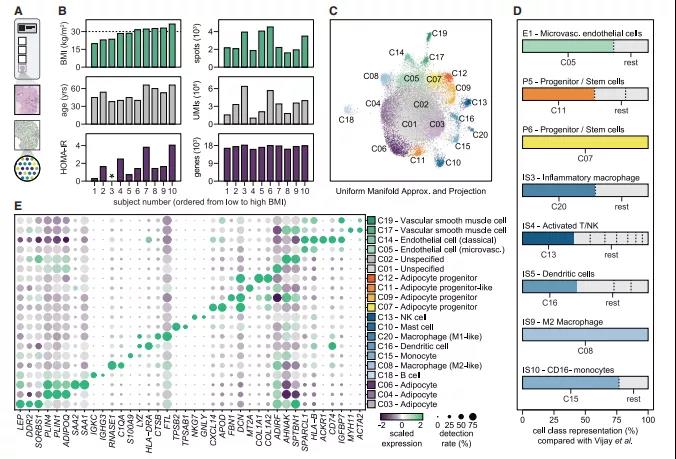 作者使用10x Genomics Visium平臺對?WAT中的細(xì)胞類型的異質(zhì)性和空間位置進(jìn)行了研究。通過穿刺活檢獲得體重指數(shù)、年齡和對胰島素敏感性均有差異的10個人的腹部皮下WAT樣本。對其覆蓋27,937個spots的數(shù)據(jù)進(jìn)行空間轉(zhuǎn)錄組分析,結(jié)果發(fā)現(xiàn)每個切片平均檢測17,303個獨特基因和3,280,607個UMIs(圖1B)。通過對數(shù)據(jù)進(jìn)一步分析,共鑒定了?20種不同的細(xì)胞類群(C01-C20;圖1C),且存在于所有捐助者中。接下來,將目前的結(jié)果與最近發(fā)表的人類WAT間質(zhì)血管的單細(xì)胞數(shù)據(jù)進(jìn)行整合分析?,結(jié)果表明,空間數(shù)據(jù)包含了內(nèi)皮細(xì)胞、免疫細(xì)胞和祖細(xì)胞的特定群體(圖1D)。人工注釋標(biāo)記基因協(xié)助作者對20類細(xì)胞類型進(jìn)行標(biāo)注(圖1E),主要包括免疫細(xì)胞(單核細(xì)胞[C15], Ml-like[C20]和 M2-like 巨噬細(xì)胞[C08],樹突細(xì)胞[C16],肥大細(xì)胞[C10], B細(xì)胞[C18]和NK細(xì)胞[C13]),血管細(xì)胞(微血管 [C05]和經(jīng)典[C14]內(nèi)皮細(xì)胞和血管平滑肌細(xì)胞[C17 / C19])和脂肪細(xì)胞祖細(xì)胞(C07 / C09 / C12)。在后者中,C07表達(dá)成熟的前脂肪細(xì)胞/脂肪干細(xì)胞標(biāo)記物,C09表達(dá)編碼纖維化和細(xì)胞外基質(zhì)蛋白的轉(zhuǎn)錄本,而C12是前兩者的混合。一個祖細(xì)胞類群(C11)富集了多個編碼金屬硫蛋白的基因,在立體分析中將其歸為祖細(xì)胞(圖1D)。然而,在UMAP中,它從其他三個祖細(xì)胞中分離出來,因此,作者確定了其特征基因在脂肪生成的整體轉(zhuǎn)錄譜和WAT的不同組分中的表達(dá)。這些分析證實了C11在脂肪祖細(xì)胞中富集,并在人類脂肪形成過程中瞬時表達(dá)。