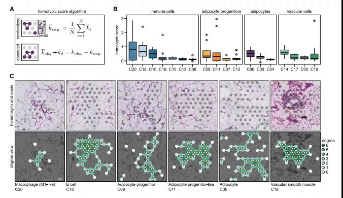 ? ? ? ?為了確定不同細(xì)胞類型之間的空間關(guān)系,作者還開發(fā)了一種算法對異型鄰域分析 (圖3A),揭示了幾種關(guān)聯(lián)性(圖3B,3C)。正如預(yù)期的那樣,較大血管結(jié)構(gòu) (C14/C17/C19)彼此之間的距離比與血管樣組織的距離更加靠近;M2-like巨噬細(xì)胞(C08)經(jīng)常位于兩種脂肪祖細(xì)胞附近:C09的同型簇(圖3C)和分散的C12,這與小鼠研究一致。此外,樹突狀細(xì)胞(C16)與其他免疫細(xì)胞表現(xiàn)出較高的異型評分,而兩類成熟脂肪細(xì)胞(C03/C04)相互共定位,并與C06脂肪細(xì)胞明顯分離??傊?,異型鄰域分析表明,WAT的空間定義比預(yù)期的更明確,具有特定的細(xì)胞-細(xì)胞關(guān)系。