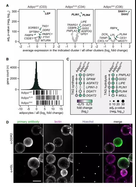 ? ? ? ? ? ?作者的分析確定了三種不同類型的成熟脂肪細(xì)胞,它們具有不同的轉(zhuǎn)錄譜和空間排列。作者進(jìn)一步定義了每個亞型的標(biāo)記基因(圖4A),結(jié)果發(fā)現(xiàn)了LEP(編碼脂肪因子瘦素)、PLIN1/PLIN4(編碼脂滴蛋白perilipin-1和-4)和SAA1/SAA2(編碼血清淀粉樣蛋白A1和A2急性期蛋白質(zhì))是各分類中最獨特的基因。因此,作者將這些亞群體命名為Adipo LEP、Adipo PLIN和Adipo SAA。如結(jié)果所示,Adipo LEP富集了細(xì)胞-細(xì)胞/基質(zhì)細(xì)胞相互作用蛋白和瘦素信號/分泌調(diào)節(jié)基因。AdipoPLIN標(biāo)記基因與葡萄糖和脂質(zhì)代謝以及脂肪因子脂聯(lián)素相關(guān)。雖然Adipo SAA與Adipo PLIN有一些共同的標(biāo)記基因,但這類基因也富集了多種與視黃醇代謝及結(jié)合的多種脂肪因子和酶。為了證實這三種亞型的標(biāo)記基因在成熟脂肪細(xì)胞中表達(dá),作者分析了大量配對樣本的轉(zhuǎn)錄組學(xué)數(shù)據(jù),比較了從WAT中分離的脂肪細(xì)胞和非脂肪細(xì)胞。相關(guān)數(shù)據(jù)表明,50個標(biāo)記基因在脂肪細(xì)胞中富集(圖4B),說明Adipo LEP、AdipPLIN和AdipoSAA代表不同類型的脂肪細(xì)胞。空間數(shù)據(jù)的進(jìn)一步分析顯示,這些亞型表現(xiàn)出相互的表達(dá)模式(圖4C)。作者用針對AdipoLEP(DDR2)和Adipo PLIN (HSL,由LIPE編碼)標(biāo)記蛋白的抗體對從人皮下WAT分離的成熟脂肪細(xì)胞進(jìn)行染色,驗證了該結(jié)果(圖4D)。此外,還使用針對CD36(Adipo PLIN的標(biāo)記物)和 CSDEl(Adipo LEP的標(biāo)記物)的抗體對人類成熟脂肪細(xì)胞進(jìn)行了免疫共標(biāo)記,觀察到其相互的染色模式。對于Adipo SAA,作者進(jìn)行了多種抗體的測試,但沒有一種抗體顯示出足夠的特異性。綜上所述,空間數(shù)據(jù)可在蛋白質(zhì)水平上進(jìn)行概述,并支持所鑒定的脂肪細(xì)胞具有不同表達(dá)譜的亞群。