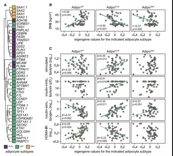 ? ? ? ??接下來,作者的目標(biāo)是了解脂肪細(xì)胞亞型對組織功能的貢獻(xiàn)。為深入了解脂肪細(xì)胞亞型方面的功能,作者對56女性的WAT轉(zhuǎn)錄組數(shù)據(jù)進(jìn)行了綜合分析,其中還對新鮮分離的脂肪細(xì)胞進(jìn)行了脂肪分解/脂肪生成測量。在比較56名女性數(shù)據(jù)時,Adipo PLIN、Adipo LEP和Adipo SAA標(biāo)記基因形成了單獨的、共同調(diào)控的集群(圖6A),可用來確定細(xì)胞類型豐度和脂肪細(xì)胞表型之間的關(guān)系。與空間數(shù)據(jù)一致 ,Adipo PLIN在肥胖人群中的比例降低,分析顯示Adipo PLIN與BMI之間負(fù)相關(guān),AdipoSAA與BMI也呈負(fù)相關(guān),而AdipoLEP呈正相關(guān)(圖6B)。