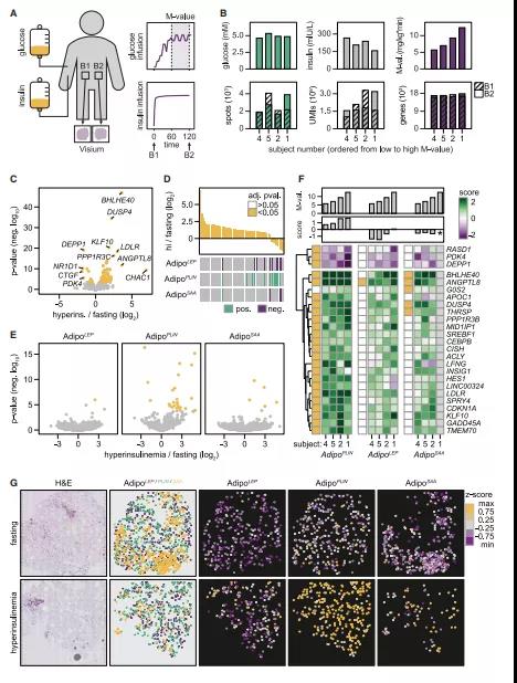 ? ? ? ??在脂肪細(xì)胞中,兒茶酚胺刺激脂肪分解,胰島素抑制脂肪分解促進(jìn)脂肪生成。通過校正BMI(圖6c),作者觀察到AdipoPLIN和兩種脂解指標(biāo)之間存在正相關(guān),而AdipoLEP與這些參數(shù)沒有或弱負(fù)相關(guān)。對于胰島素刺激脂肪生成,研究發(fā)現(xiàn)Adipo PLIN與此指標(biāo)呈正相關(guān),AdipoLEP呈負(fù)相關(guān)。相比之下,AdipoSAA與任何研究參數(shù)均無顯著相關(guān)性??傊@表明Adipo PLIN與AdipoSAA相比,Adipo PLIN與更明顯的胰島素反應(yīng)有關(guān)。為了在人體內(nèi)測試這一發(fā)現(xiàn),作者在高胰島素-微生物-正血糖鉗夾2小時后,從10個個體中的4個收集了 WAT樣本,并進(jìn)行了空間轉(zhuǎn)錄組分析(圖7A,7B)。穩(wěn)定狀態(tài)下的胰島素平均濃度是空腹?fàn)顟B(tài)下的10倍,從葡萄糖處理率(m值)可以看出,4例患者均表現(xiàn)出明顯的胰島素敏感性(圖7B)。高胰島素血癥的空間數(shù)據(jù)與禁食狀態(tài)下獲得的樣本質(zhì)量相似(圖7B),兩者的比較在基因表達(dá)水平上明確了胰島素反應(yīng)(圖7C)。這些數(shù)據(jù)與之前報道的高胰島素鉗夾隊列的大量組織RNA測序顯示出一致的結(jié)果,表明空間分析捕捉到了胰島素的急性反應(yīng)。盡管胰島素誘導(dǎo)了一個快速的轉(zhuǎn)錄反應(yīng),但在這個時間框架內(nèi),它本身并不是脂肪細(xì)胞異質(zhì)性的驅(qū)動因素(圖7D)。接下來,作者根據(jù)細(xì)胞類型進(jìn)行胰島素反應(yīng)分析。對于脂肪細(xì)胞,在AdipoPLIN中有多個基因?qū)σ葝u素有顯著反應(yīng),AdipoSAA中變少,而AdipoLEP中只有一個基因(圖7E)。作者評估了個體間對胰島素的轉(zhuǎn)錄反應(yīng)是否存在數(shù)量差異,分析結(jié)果表明,Adipo PLIN反映了 M-values值,但這在其他兩個亞型中不明顯(圖7F和7G)??傊@些數(shù)據(jù)表明,體內(nèi)對胰島素的轉(zhuǎn)錄反應(yīng)主要歸因于Adipo PLIN,而其他脂肪細(xì)胞亞型對高胰島素血癥仍然沒有反應(yīng)。