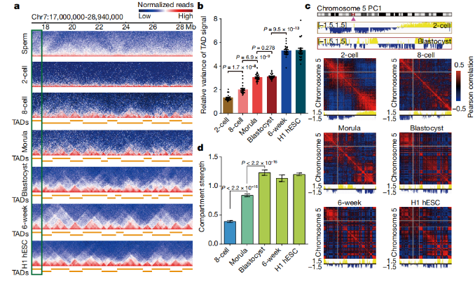 總之,這些數(shù)據(jù)表明,TAD結(jié)構(gòu)在人的2細(xì)胞胚胎中基本上不存在,在8細(xì)胞胚胎中很少存在,并且在胚胎發(fā)育過程中變得越來越明顯。