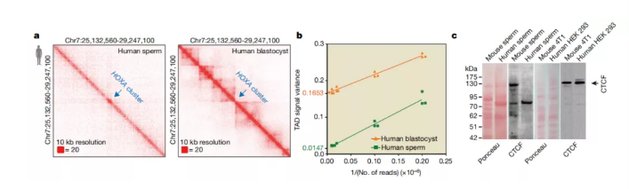 CTCF-cohesin復(fù)合物在高級(jí)染色質(zhì)結(jié)構(gòu)中具有重要作用。本研究調(diào)查了人類和小鼠精子中CTCF和粘著蛋白的水平。RAD21是黏附蛋白復(fù)合物的一個(gè)亞基,存在于人類和小鼠的精子中);但是,在人類精子中未檢測(cè)到CTCF,并且在使用短干擾RNA(siRNA)耗盡CTCF的細(xì)胞系中表達(dá)很弱,但是在小鼠精子,人類和對(duì)照小鼠細(xì)胞系中檢測(cè)到了CTCF(圖2c)。由于CTCF的消耗會(huì)導(dǎo)致TAD結(jié)構(gòu)的破壞,因此CTCF的缺乏可能是人類精子中TAD結(jié)構(gòu)喪失的基礎(chǔ)。