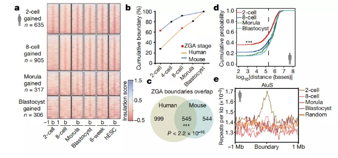 TAD結(jié)構(gòu)在人類2細(xì)胞胚胎中并不明顯。但是,兩細(xì)胞胚胎中的某些區(qū)域顯示出絕緣子結(jié)合的跡象,可以分隔上游和下游相互作用。在胚胎后期,這些區(qū)域大部分成為TAD邊界(圖3a); 這些區(qū)域因此可以被視為未成熟的TAD邊界。在這項(xiàng)研究中,本研究將未成熟的TAD邊界和成熟的TAD邊界都定義為絕緣邊界。然后,本研究分析了人類胚胎發(fā)育過程中絕緣邊界的動(dòng)力學(xué)。本研究的數(shù)據(jù)表明,分別在2細(xì)胞,8細(xì)胞,morula 和胚泡階段分別形成635、905、317和306個(gè)絕緣邊界(圖3a)。本研究還在小鼠2細(xì)胞胚胎中發(fā)現(xiàn)了未成熟的TAD邊界,并確定了小鼠階段獲得的絕緣邊界。比較了人類樣品中2細(xì)胞階段的絕緣邊界與胚泡階段的總邊界,結(jié)果表明2細(xì)胞邊界與胚泡邊界的30%重疊(圖3b)。本研究的數(shù)據(jù)還顯示ZGA階段包含胚泡中67%的邊界,這與小鼠模型中的比例相似(圖3b)。此外,當(dāng)將ZGA階段的人類邊界與小鼠的邊界進(jìn)行比較時(shí),發(fā)現(xiàn)存在明顯的重疊(圖3c)。例如,本研究在人和小鼠的ZGA階段發(fā)現(xiàn)了TTC1和CCNG1基因周圍的絕緣邊界。