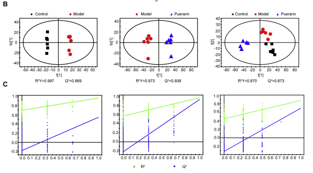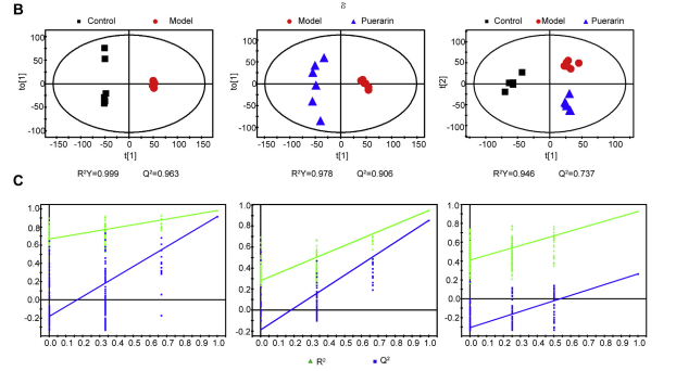圖3A和圖4a顯示了小鼠肝臟組織和尿液的代表性1H NMR譜圖。為了研究NASH對(duì)小鼠代謝紊亂的影響,基于小鼠肝組織和尿液樣本的歸一化核磁共振波譜數(shù)據(jù),計(jì)算PCA和OPLS-DA模型,揭示葛根素的干預(yù)作用。觀察到對(duì)照組和模型組之間肝臟和尿代謝表型的清晰分離(圖3B, 4b和S1),表明MCD飲食誘導(dǎo)小鼠NASH后發(fā)生了一些顯著的生化變化。此外,PCA 和 OPLS-DA 得分圖揭示肝臟和泌尿代謝的完全分化模型和葛根素組之間的概況以及顯示葛根素組有恢復(fù)到健康對(duì)照組的趨勢(shì),這可能歸因于葛根素對(duì)NASH的治療效果。兩個(gè)模型參數(shù)R2Y 和 Q2 以及置換測(cè)試的結(jié)果說(shuō)明了OPLS-DA 模型的有效性(圖 3C 和 4C)。