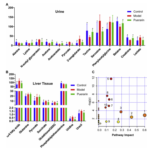 基于來(lái)自 OPLS-DA 模型的 VIP 值(VIP ≥ 1)和來(lái)自單變量統(tǒng)計(jì)分析的 P 值 (P < 0.05),8 和 13顯著改變與 NASH 相關(guān)的內(nèi)源性代謝物是分別被鑒定為肝組織和尿液中的潛在生物標(biāo)志物(圖 5A 和 B,以及表 1)。肝臟代謝特征NASH 模型小鼠的 w-6 脂肪酸水平升高,谷氨酰胺、丙酮酸、琥珀酸、谷胱甘肽/GSSG、尿苷和尿嘧啶,連同的磷脂酰乙醇胺水平降低。關(guān)于健康控制與對(duì)照組相比,模型組尿中n -乙酰糖蛋白(NAG)、丙酮酸、2-氧戊二酸、肌氨酸、苯乙酰甘氨酸、乳酸水平升高,丙氨酸、賴氨酸、丙酮、乙酰乙酸、牛磺酸、甜菜堿、肌酐水平降低。此外,除了肝臟組織中的谷氨酰胺、丙酮酸和磷脂酰乙醇胺(PE)以及尿液中的丙氨酸和苯乙酰甘氨酸外,所有與NASH相關(guān)的潛在生物標(biāo)志物均被葛根素顯著逆轉(zhuǎn)。