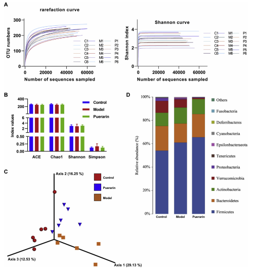 廣州中醫(yī)藥大學(xué)藥學(xué)院、 廣東藥科大學(xué)中醫(yī)學(xué)院、中山大學(xué)附屬第六醫(yī)院聯(lián)合在Journal of Pharmaceutical and Biomedical Analysis雜志發(fā)表以“Therapeutic potential of puerarin against methionine-choline-defificient diet-induced non-alcoholic steatohepatitis determined by combination of 1H NMR spectroscopy-based metabonomics and 16S rRNA gene sequencing”為題的文章,揭示葛根素對(duì)非酒精性脂肪性肝炎的治療方向的相關(guān)研發(fā)現(xiàn),從而為非酒精性脂肪性肝病的治療提出新的見(jiàn)解理論基礎(chǔ)。其中微生物多樣性檢測(cè)由百邁客協(xié)助完成。