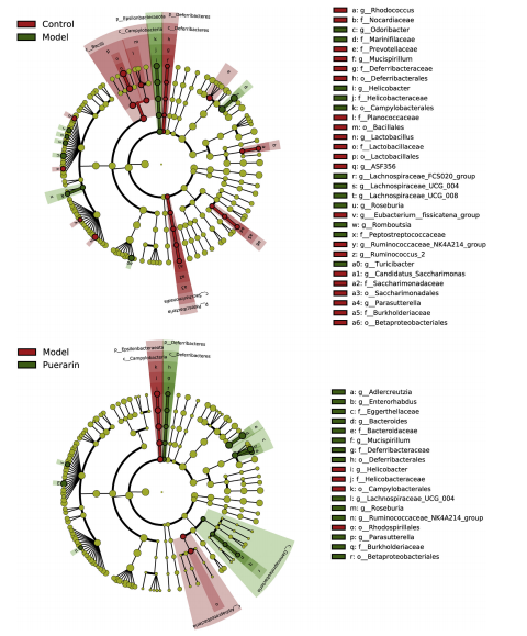門(mén)水平的分類分析表明,厚壁菌門(mén)、擬桿菌門(mén)和放線菌門(mén)在所有類群的糞便微生物群落中占優(yōu)勢(shì)。與對(duì)照組相比,模型組的Epsilonbacteraeota水平較高,而葛根素處理可逆轉(zhuǎn)這一趨勢(shì)(圖7D)。采用LEfSe方法,篩選出LDA評(píng)分大于2.0的明顯改變的類群,以鑒定類群間(門(mén)到屬)的差異類群。如圖8和圖9所示,在對(duì)照組和模型組之間,模型和葛根素組之間,共發(fā)現(xiàn)了40和24個(gè)不同的細(xì)菌分類分支。有趣的是,在葛根素治療后,14種不同的細(xì)菌類群在NASH小鼠中顯示出相同的恢復(fù)正常水平的趨勢(shì),包括p Epsilonbacteraeota, c Campylobacteria、o彎曲菌目、 f 螺桿菌科、 g幽門(mén)螺桿菌屬、p 脫鐵桿菌門(mén)、c 脫鐵桿菌、 o 脫鐵桿菌、 f 脫鐵桿菌科、g Mucispirillum、o Betaproteobacteriales、f burkholderaceae、g Parasutterella 和g瘤胃球菌科NK4A214組。值得一提的是,模型小鼠中氏菌屬的成員比對(duì)照組小鼠大,葛根素治療后進(jìn)一步擴(kuò)大。(字母 p、c、o、f 和 g 分別代表門(mén)、綱、目、科和屬)