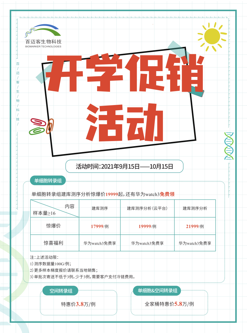 百邁客為您提供了最實(shí)惠的開(kāi)學(xué)季促銷好禮,產(chǎn)品覆蓋二代微生物、三代微生物、微生物多組學(xué)以及單細(xì)胞系列產(chǎn)品,詳情活動(dòng)可見(jiàn):百邁客醫(yī)學(xué)開(kāi)學(xué)促銷活動(dòng),快快上車(chē)~