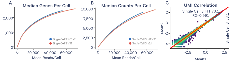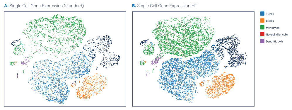單細胞基因表達HT產(chǎn)生的數(shù)據(jù)可與標準分析的數(shù)據(jù)相比較,在每個細胞成本降低的情況下,細胞數(shù)量增加了一倍,更利于鑒定更多的細胞表型和分子調(diào)控機制。