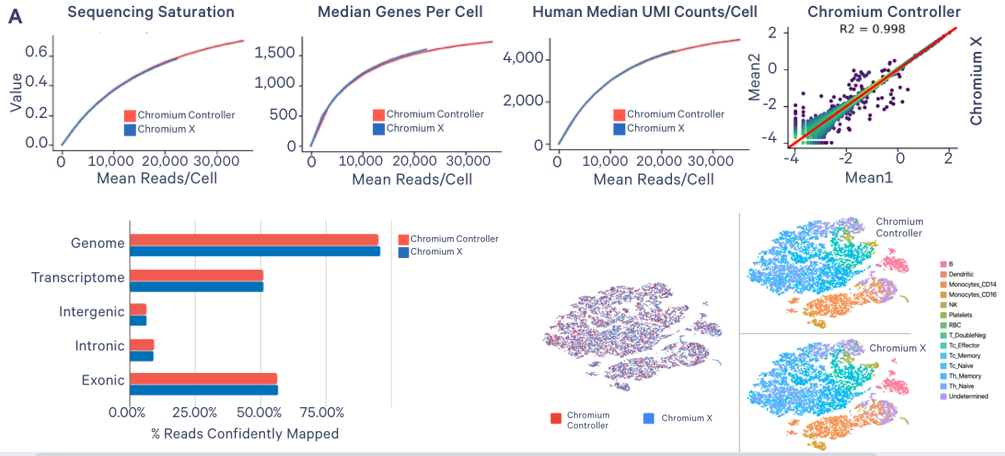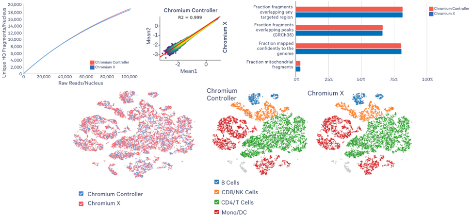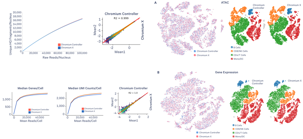 單細胞Chromium X系統(tǒng)可兼容單細胞系列產(chǎn)品,且與Controller系統(tǒng)數(shù)據(jù)保持極強的相關(guān)性。以下分別展示利用PBMCs捕獲10000個細胞/細胞核Chromium X和Controller系統(tǒng)的數(shù)據(jù)分析比較: