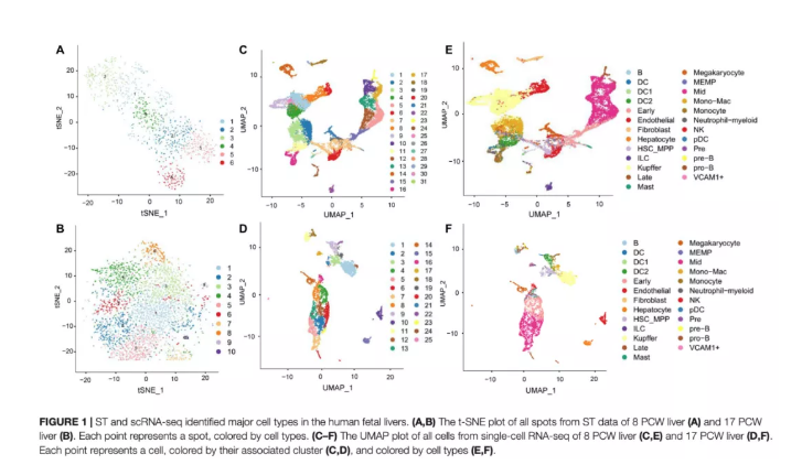 為了研究胎兒肝臟中免疫細(xì)胞和紅細(xì)胞的發(fā)育,作者利用ST技術(shù)分析了人類肝臟發(fā)育過程中基因表達(dá)的時(shí)空動(dòng)態(tài)。在篩選數(shù)據(jù)后,在8周PCW肝臟中檢測到1267個(gè)高質(zhì)量spots,平均每個(gè)spot包含204,628條reads,檢測到1,132個(gè)基因和5,924個(gè)UMIs。在17周PCW中,肝臟由3,489個(gè)單獨(dú)spots組成,平均78,576條reads,8,829個(gè)UMI,過濾后每個(gè)點(diǎn)檢測到2,266個(gè)基因。通過對每個(gè)ST陣列的spots進(jìn)行降維和聚類,根據(jù)基因表達(dá)模式在8周PCW肝臟(圖1A)和17周PCW肝臟(圖1B)中確定了6個(gè)和10個(gè)主要cluster。由于ST缺乏細(xì)胞分辨率,作者利用scRNA-seq技術(shù)研究了8周PCW和17周PCW活組織的基因表達(dá)異質(zhì)性。在應(yīng)用質(zhì)量控制過濾器和標(biāo)準(zhǔn)化后,scRNA序列數(shù)據(jù)分別25,186個(gè)細(xì)胞和9,153個(gè)細(xì)胞組成,每個(gè)細(xì)胞中有2,454和2,705個(gè)獨(dú)特表達(dá)的基因。為了探索活體器官的細(xì)胞組成,作者處理了單細(xì)胞數(shù)據(jù),并在8和17周PCW肝臟中鑒定了31和25種細(xì)胞狀態(tài),每種狀態(tài)都根據(jù)文獻(xiàn)中已知的標(biāo)記基因進(jìn)行了注釋(圖1C-F)。作者將這些cluster鑒定為B細(xì)胞、樹突狀細(xì)胞(DC)、DC1、DC2、早期成紅細(xì)胞、內(nèi)皮細(xì)胞、HSC_MPP、成纖維細(xì)胞、肝細(xì)胞、kuper、ILC、晚期成紅細(xì)胞、MEMP、肥大細(xì)胞、巨核細(xì)胞、中成紅細(xì)胞、單核細(xì)胞、中性粒細(xì)胞、NK、pDC、Pre、Pre-B、Pro-B和VCAM1+。