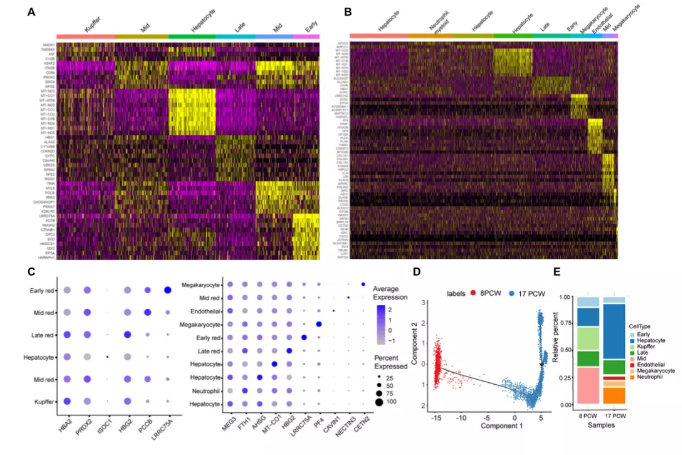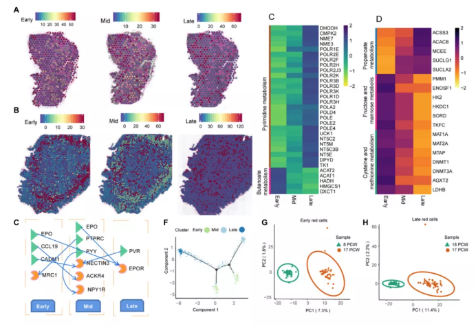 對下調(diào)基因的KEGG富集分析顯示,最顯著的包括果糖和甘露糖代謝、半胱氨酸和蛋氨酸代謝、?;撬岷偷团;撬岽x、組氨酸和硫胺代謝相關(guān)的信號通路。上調(diào)基因的高度富集項(xiàng)與丙酸代謝有關(guān)(圖5D)。作者進(jìn)行了早、中、晚期細(xì)胞間的配體-受體相互作用分析,發(fā)現(xiàn)在早期-中晚期細(xì)胞通訊中發(fā)現(xiàn)了促紅細(xì)胞生成素(EPO)、蛋白酪氨酸磷酸酶受體C(PTPRC)、連接蛋白細(xì)胞粘附分子3(NECTIN3)(圖5E)。此外,還對紅細(xì)胞的分化軌跡進(jìn)行了分析,得出了一條緊密相連的分化軌跡,分化成五個(gè)主要分支(圖5F)。這表明系統(tǒng)是通過一個(gè)連續(xù)的而不是幾個(gè)斷開的譜系來維持的。此外,在8PCW肝臟和17PCW肝臟的早期、中期和晚期紅細(xì)胞中分別鑒定了617、674和503個(gè)DEGs。為了進(jìn)一步了解8PCW肝臟和17PCW肝臟之間紅細(xì)胞的差異,對兩個(gè)胚胎階段的基因表達(dá)模式進(jìn)行了PCA分析。從每種細(xì)胞類型中取樣50個(gè)點(diǎn)以產(chǎn)生平衡的數(shù)據(jù)集,并且發(fā)現(xiàn)基于它們的轉(zhuǎn)錄相似性可以區(qū)分8 PCW和17 PCW肝臟中的所有點(diǎn)(圖5G,H)。