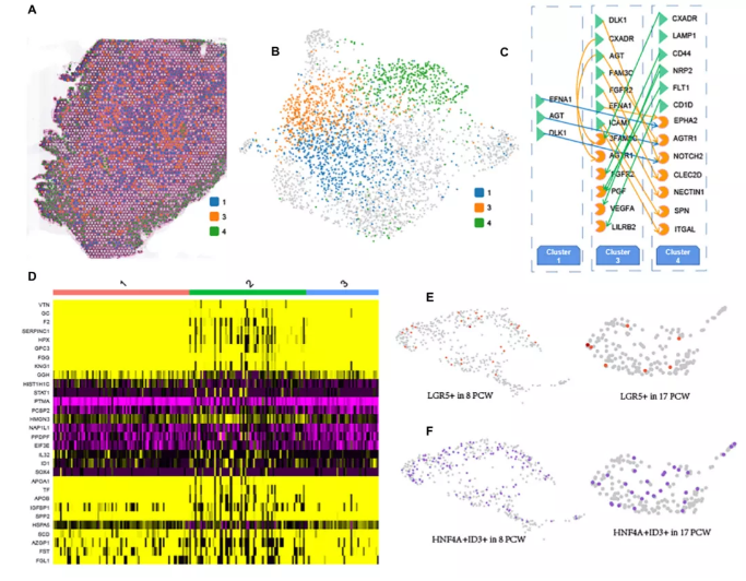 如圖3E所示,肝細(xì)胞是17 PCW肝臟的主要實(shí)質(zhì)細(xì)胞。作者觀察到三個(gè)不同的肝細(xì)胞cluster(cluster1、3和4)沿著17周PCW肝臟的空間深度分布(圖4A、B)。作者發(fā)現(xiàn)MEG3、ITIH3和HMGCS1呈cluster1高表達(dá)。FGB、IGFBP1和A2M基因在cluster3中表達(dá)更高,表明區(qū)域DEGs可能參與了相應(yīng)區(qū)域特異性功能的形成。此外,cluster4組中的肝細(xì)胞高表達(dá)數(shù)個(gè)基因,包括MT-CO1、MT-CO2、MT-CO3,它們參與線粒體電子傳遞和氧化磷酸化。值得注意的是,cluster1和3主要聚集在肝組織的中心區(qū)域,cluster4主要聚集在肝的周圍區(qū)域(圖4a)。差異表達(dá)分析的熱圖顯示肝細(xì)胞分化過程中逐漸下調(diào)或上調(diào)的基因。GO分析表明,1-3-4cluster中逐漸上調(diào)的基因主要與細(xì)胞極性通路、Wnt信號通路和GTPase活性的調(diào)節(jié)有關(guān),而逐漸下調(diào)的基因則參與壞死細(xì)胞死亡、糖原生物合成過程的調(diào)節(jié),肝臟再生。此外,作者描述了cluster1-3-4細(xì)胞之間的細(xì)胞通訊(圖4C),為將來的研究提供了潛在的信號轉(zhuǎn)導(dǎo)信息。值得注意的是,盡管cluster3和cluster1的距離更近,但cluster3與cluster4細(xì)胞的信號轉(zhuǎn)導(dǎo)比cluster1細(xì)胞更為顯著。此外,作者還發(fā)現(xiàn)了一些共享的和活躍的配體-受體對,如DLK1-NOTCH2、EFNA1EPHA2、AGT-AGTR1,這些配體-受體對既存在于cluster1細(xì)胞與cluster4細(xì)胞的細(xì)胞通訊中,也存在于cluster3細(xì)胞與cluster4細(xì)胞的細(xì)胞通訊中。