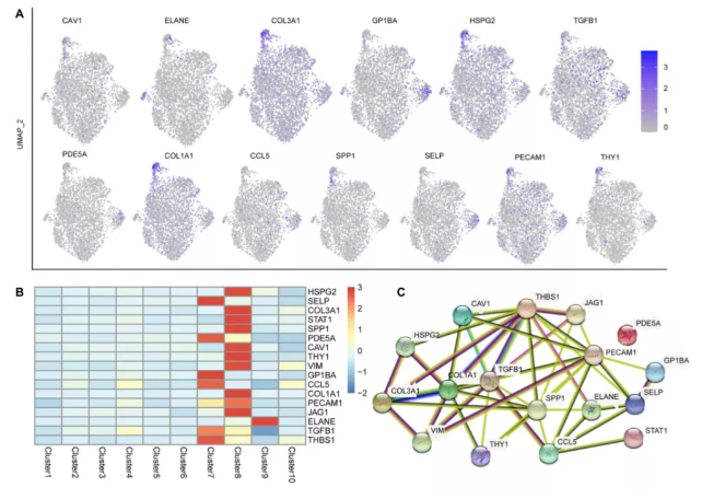 為了進(jìn)一步揭示這一現(xiàn)象,作者分析了這17種肝病相關(guān)基因在17PCW胚胎腎臟中的表達(dá)水平。除PECAM1外,其余基因在17PCW腎中表達(dá)。但其表達(dá)模式與肝臟不同,主要不在巨核細(xì)胞和內(nèi)皮細(xì)胞中表達(dá),說明這些肝病相關(guān)基因在胚胎肝臟中具有獨(dú)特的基因表達(dá)模式。此外,對這17個(gè)肝病相關(guān)基因的蛋白質(zhì)相互作用網(wǎng)絡(luò)分析顯示TGFB1、COL1A1、SPP1、PECAM1和THBS1在表達(dá)網(wǎng)絡(luò)中起關(guān)鍵作用,而PDE5A與其他基因沒有相互作用(圖6C)。