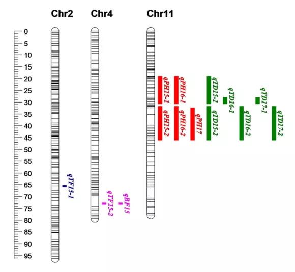 為了檢測F1群體中與4個性狀相關(guān)的位點,對其進(jìn)行QTL分析。對于PH,結(jié)合3年的表型,在11號染色體上共鑒定到5個QTLs(qPH15-1, qPH16-1, qPH15-2, qPH16-2和qPH17),這些QTLs對表型變異的解釋范圍為17.20% ~ 22.40%。對于TD,共定位到6個QTLs(qTD15-1, qTD16-1, qTD17-1, qTD15-2, qTD16-2和qTD17-2),均位于11號染色體上,對表型變異解釋范圍為14.00~20.80%,PH與TD定位結(jié)果相重疊,均位于兩個QTL簇,該結(jié)果進(jìn)一步證實了PH和TD在表型上呈顯著正相關(guān)。對TF,定位到2個QTLs(qTF15-1和qTF15-2),分別位于2和4號染色體上,解釋表型變異率分別為8.80%和9.20%;另外,還定位到1個BF相關(guān)的QTL qBF15,可以解釋34.80%的表型變異。qTF15-2和qBF15在4號染色體被定位到同一個染色體區(qū)間內(nèi)。