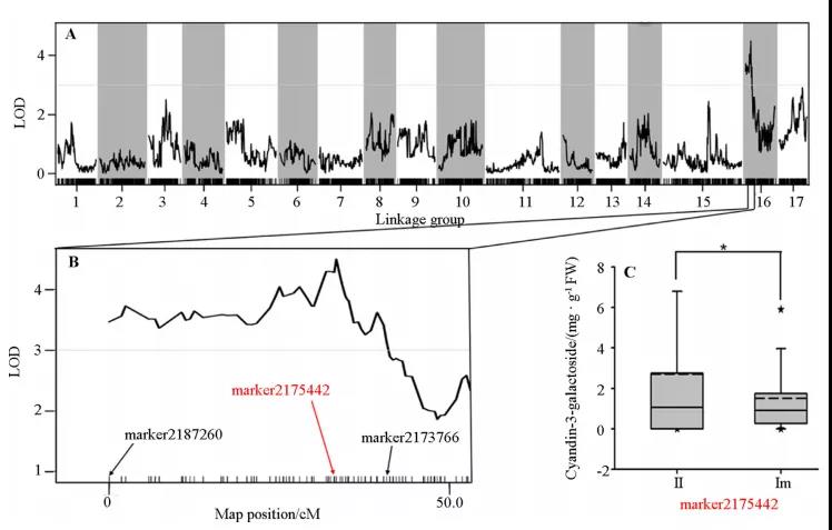 采用Kruskal-Wallis檢驗對矢車菊素半乳糖苷濃度進(jìn)行QTL分析,采用區(qū)間作圖(IM)和多QTL模型(MQM)檢測潛在的QTL,閾值LOD為3.0。結(jié)果顯示,只在‘Red3’的LG16位點的頂端檢測到一個LOD值為4.49的QTL,該QTL的區(qū)間范圍為0 ~ 40.79 cM,解釋表型變異率為14.4%。此外,該QTL兩側(cè)有兩個標(biāo)記,分別是marker2187260 ~ marker2173766,作者進(jìn)一步調(diào)查了不同株型之間的表型差異,結(jié)果表明,最接近QTL峰的標(biāo)記之一mark2175442將分離群體分為純合子ll型和雜合子lm型兩類。純合子ll型表現(xiàn)出明顯高于雜合子lm 型的矢車菊素半乳糖苷濃度。結(jié)合前人的研究,該研究結(jié)果表明,LG16頂部的QTL熱點區(qū)域可能在控制蘋果紅肉著色中發(fā)揮潛在的作用。