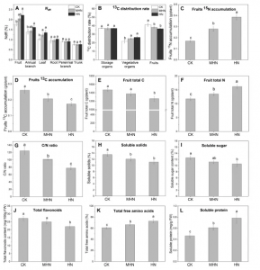 實驗材料:紅富士蘋果(7齡;中國東北部山東省煙臺市)。對照組CK:正常尿素處理組(300 kg N/hm2,每棵樹435 g尿素);實驗組MHN:中高氮處理組(600 kg N/hm2,每棵樹870 g尿素);實驗組HN:高氮處理組(800 kg N/hm2,每棵樹1160 g尿素)。在開花后183天進行13C標(biāo)記。