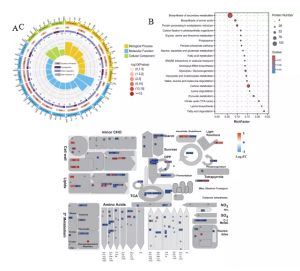 共獲得5340個蛋白質(zhì),與對照相比,795個DEPs在HN中顯示出顯著變化,其中422個蛋白上調(diào),373個蛋白下調(diào)。GO富集分析顯示氧化作用?還原過程和應(yīng)激反應(yīng)富含更多的蛋白質(zhì),而下調(diào)的蛋白質(zhì)富集程度更高(圖3A)。KEGG分析發(fā)現(xiàn)C代謝、丙酮酸代謝、糖酵解/糖異生、三羧酸(TCA)循環(huán)、次級代謝產(chǎn)物生物合成和氨基酸生物合成途徑顯著富集(圖3B)。MapMan分析結(jié)果顯示許多DEP參與主要和次要CHO代謝、糖酵解、TCA循環(huán)、氨基酸代謝和次級代謝,并且大多數(shù)這些蛋白質(zhì)被發(fā)現(xiàn)下調(diào)(圖3C)。