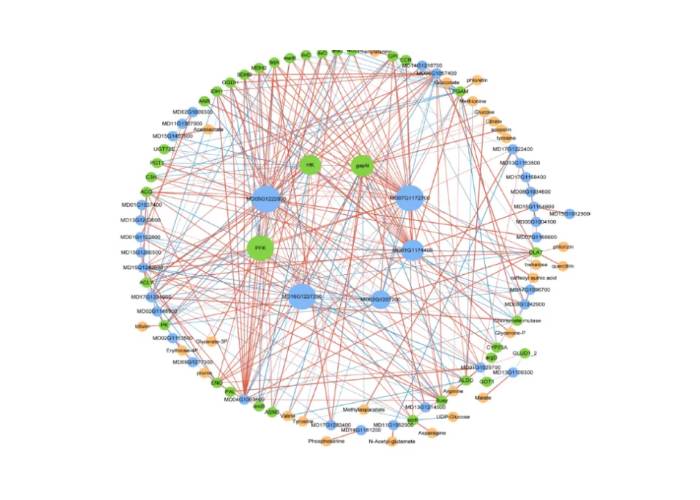 基于Pearson相關(guān)分析(系數(shù)>0.9,P<0.05),篩選與初級代謝和次級代謝相關(guān)的基因、蛋白質(zhì)和代謝物(圖7)。獲得5個hub基因和3個hub蛋白,其中MD07G1172700(編碼PAL)包含在次級代謝中,MD05G1222800(編碼argD)、MD16G1227200(編碼leuC)、MD01G1174400(編碼GLUD1_2)、MD02G1207200(編碼tktA)、PFK、gapN,而HK則包含在初級代謝中。這些hub基因和蛋白質(zhì)之間存在著相對較多的正相關(guān)節(jié)點。