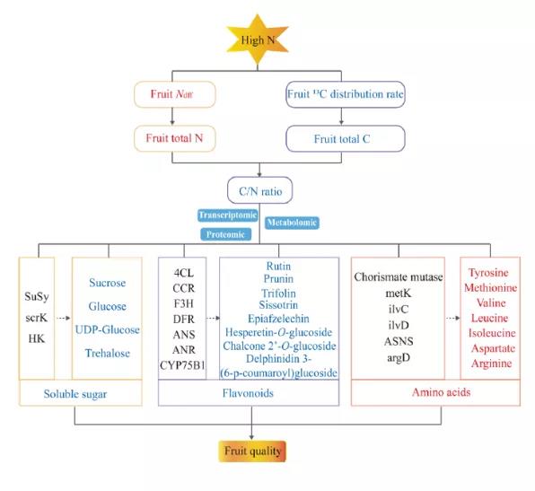 高氮增加了果實對15N的吸收和調(diào)節(jié)能力,降低了C在果實中的分配率,從而導(dǎo)致蘋果果實的總N增加,總C和C/N比率降低。高氮破壞了蘋果C?N平衡,降低了蘋果果實的可溶性糖和總黃酮含量,進而使果實品質(zhì)惡化。基于多組學(xué)分析,揭示了高氮對初級代謝和次級代謝互作網(wǎng)絡(luò)。高氮調(diào)節(jié)了蘋果果實中基因和蛋白質(zhì)的表達,抑制了碳水化合物和黃酮類化合物的積累,更多的碳骨架被用來合成氨基酸及其衍生物并轉(zhuǎn)移到氮代謝中。本研究揭示了高氮導(dǎo)致蘋果果實糖和類黃酮含量下降的機理,并獲得了關(guān)鍵候選基因和蛋白質(zhì)。
