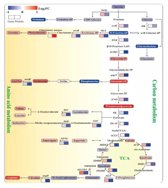 C代謝包括淀粉和蔗糖代謝、糖酵解和TCA循環(huán)。高氮總體下調(diào)了C代謝中蛋白質(zhì)(Susy、scrK和HK)的豐度和碳水化合物(蔗糖、葡萄糖和海藻糖)的積累。相反,糖酵解中間產(chǎn)物卻明顯積累,如甘油-P、甘油酸-3P和磷酸烯醇式丙酮酸。這表明蛋白質(zhì)(ALDO、gapN和ENO)與這些中間代謝物之間存在負(fù)相關(guān)。糖酵解亞型的增加表明,高氮加速了C在呼吸途徑中的流動。氨基酸與碳代謝密切相關(guān),是氮分配的主要形式。氨基酸生物合成途徑中的大多數(shù)蛋白質(zhì)表達下調(diào)(脊索酸變位酶除外),而大多數(shù)氨基酸及其中間產(chǎn)物表達上調(diào)(圖5)。以前的研究表明,隨著氮供應(yīng)的增加,非結(jié)構(gòu)性碳水化合物中的一部分C被并入氨基酸和蛋白質(zhì)中。以氨基酸形式的氮增加,使氮儲存更具成本效益。因此,C向N代謝的轉(zhuǎn)移是導(dǎo)致高氮條件下碳水化合物減少的一個重要因素,這使得水果中氨基酸和總氮含量的顯著增加。甘油酸-3P和磷酸烯醇式丙酮酸的增加是氨基酸生物合成所需C骨架增加的重要指標(biāo)。
