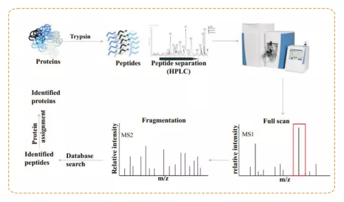 蛋白質(zhì)質(zhì)譜鑒定的基本原理是用蛋白酶將蛋白質(zhì)消化成肽段混合物,經(jīng)MAILDI或ESI等軟電離手段將其離子化,然后通過質(zhì)量分析器將具有特定質(zhì)核比的肽段離子分離開來。通過實際譜圖和理論上蛋白質(zhì)經(jīng)過蛋白酶消化后產(chǎn)生的一級質(zhì)譜峰圖和二級質(zhì)譜峰圖進行的比對,進行蛋白鑒定。