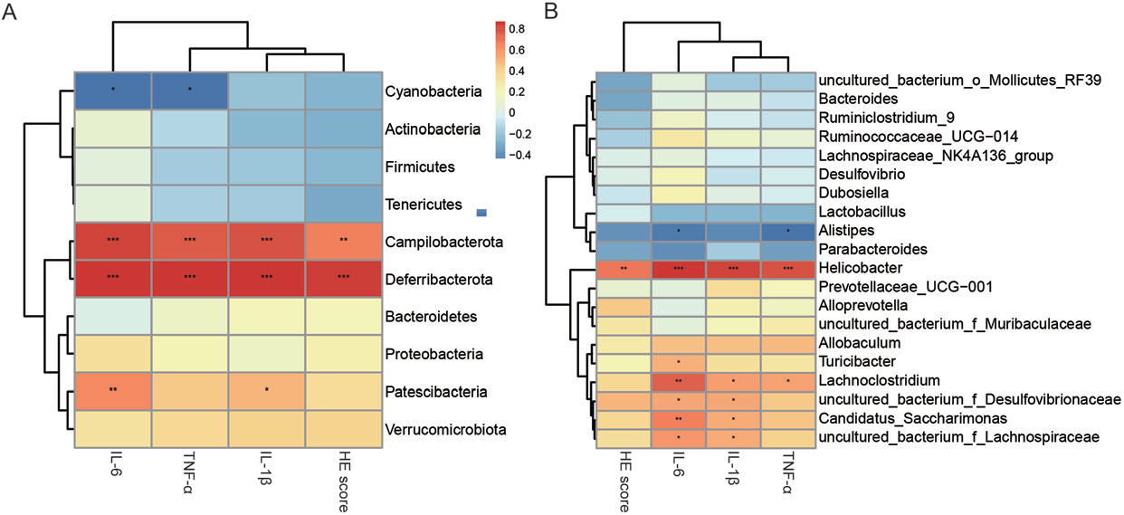 計算6組間差異,評價IL-1β、IL-6、TNF-α和HE評分對微生物群組合的影響。去鐵桿菌門與IL-6、IL-1β、TNF-α和HE評分呈正相關(guān),相關(guān)系數(shù)分別為0.852(p<0.001)、0<0.852(p<0.001)、0.843(p<0.001)和0.852(p<0.001)。藍細菌門的豐度與IL-6(r=0.523,p<0.05)和TNF-α(r=0.520,p<0.05)呈負相關(guān)。在屬水平上,幽門螺桿菌與IL-6、IL-1β、TNF-α和HE評分呈正相關(guān),相關(guān)系數(shù)分別為0.816(p<0.001)、0.776(p<0.001)、0.749(p<0.001)和0.635(p<0.01)。12B)。蛛網(wǎng)膜梭狀芽孢桿菌與IL-1β、IL-6和TNF-α也呈正相關(guān),相關(guān)系數(shù)分別為0.700(p<0.01)、0.515(p<0.05)和0.509(p<0.05)。而腐爛別樣桿菌與IL-6和TNF-α呈負相關(guān),相關(guān)系數(shù)分別為0.482(p<0.05)和0.517(p<0.05)。