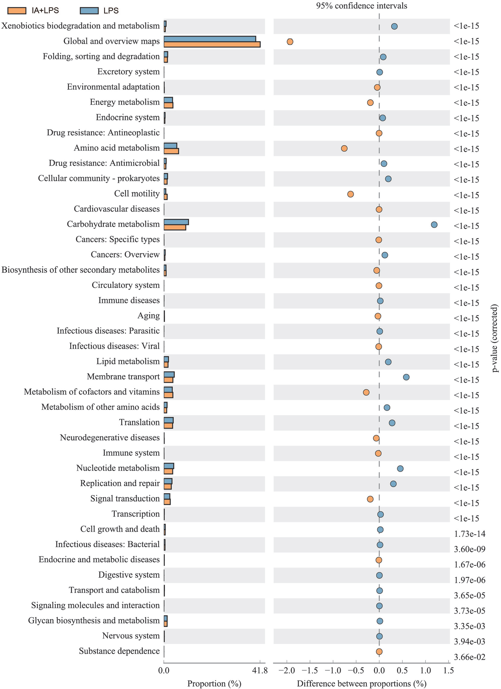 預(yù)測IA和IA+LPS組的功能基因,1343條顯著差異通路,其中“全局和概述”、“碳水化合物代謝”、“氨基酸代謝”、“能量代謝”、“輔助因子和維生素代謝”、“膜運輸”、“核苷酸代謝”、“翻譯”、“復(fù)制修復(fù)”、“信號轉(zhuǎn)導(dǎo)”的平均比例高,且都是顯著代謝途徑(p<0.05)。