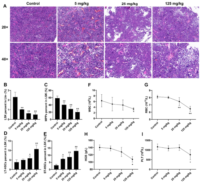 骨髓是苯暴露的主要靶器官,含有大量的造血干細胞。所有成熟的血細胞通常來源于造血干細胞( HSCs)。暴露于苯的小鼠股骨切片的H&E染色顯示出造血損傷的跡象。苯暴露小鼠骨髓中有核細胞密度明顯降低,主要表現(xiàn)為髓系造血細胞(WBC、RBC、巨核細胞和粒細胞)減少,細胞間隙增大,脂肪滴積聚,細胞腫脹。這些病理改變在125mg /kg苯組小鼠中更明顯,而在對照組中則不明顯(圖2A)。為進一步研究苯暴露對造血細胞生長和自我更新的影響,采用流式細胞術(shù)定量檢測造血干細胞LSK、多能祖細胞(MPPs)、長期造血干細胞(LT-HSCs)和短期造血干細胞(ST- HSCs)。這一結(jié)果表明,與對照組小鼠相比,接觸苯后LSK和MPPs降低,而 LT-HSCs和ST- HSCs增加(圖2B-E)。苯中毒是惡性腫瘤發(fā)生前的一種表現(xiàn),其特征是全血細胞計數(shù)顯著減少。該研究中,125 mg /kg苯組WBC、RBC、HGB和PLT水平顯著降低(P<0.05)(圖2F-I)。綜上所述,LSK比5 mg/kg和25 mg/kg苯暴露組的血液學(xué)變化更敏感,表明LSK可能是對造血損傷反應(yīng)的敏感指標。125 mg/kg苯暴露后,血液系統(tǒng)發(fā)生明顯變化,并形成苯毒性模型。