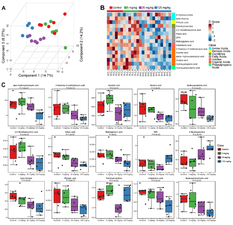 使用絕對定量代謝組學(xué)研究了苯暴露30天后血漿代謝物的差異變化。如圖4A所示,成功建立了PLS-DA模型,相似樣本聚集顯著。同時,分別用PLS-DA和Mann-Whitney U檢驗計算VIP值和P值。采用UPLC-MS/MS共鑒定了209種血漿代謝物,15種不同代謝物。在VIP>1和P<0.05閾值下,苯暴露小鼠與對照組之間的潛在生物標記物為羥基苯基乳酸),這些代謝物主要來自有機酸、脂肪酸、氨基酸、苯甲酸、肉堿、吲哚和苯丙酸(圖4B和表S2)。15種不同代謝物的劑量效應(yīng)關(guān)系如圖4C所示。