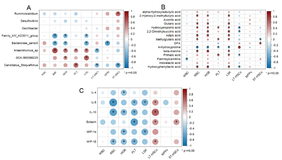 圖5.腸道微生物群、代謝產(chǎn)物和細胞因子與造血損傷的相關(guān)性。