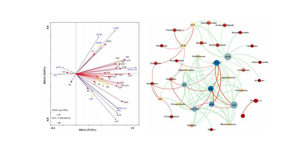 抗生素耐藥性是影響生態(tài)系統(tǒng)健康和公共衛(wèi)生的一個(gè)日益嚴(yán)重的問題。該研究在中國(guó)新鄉(xiāng)16個(gè)采樣點(diǎn)調(diào)查了9個(gè)耐藥基因(ARGs)和3個(gè)移動(dòng)遺傳元件(MGEs)及其與抗生素、重金屬和微生物群的關(guān)系。醫(yī)院排出物中氟喹諾酮類(fluoroquinolones)含量最高,動(dòng)物糞便中土霉素(oxytetracycline)含量最高。動(dòng)物糞便中鋅和銅含量最高,可能影響intI1和aac(6’)-Ib基因的擴(kuò)散。氨基糖苷類和磺胺類耐藥基因(aac(6 ‘)-Ib、aadA和sul1)是該地區(qū)主要ARGs。此外,除sul1基因外,動(dòng)物糞便中ARGs和MGEs的檢出量均高于醫(yī)院污水。另一方面,污水處理廠(MWWTPs)中抗生素(29.76-100%)、重金屬(31.25-100%)和ARGs(1-3個(gè)數(shù)量級(jí))的不完全去除導(dǎo)致這些污染物在下游河流中積累。網(wǎng)絡(luò)分析表明,ARG的潛在宿主(Jeotgalibaca、Atopostipes、Corynebacterium_1等)在動(dòng)物糞便中比在醫(yī)院污水中更占優(yōu)勢(shì),表明與醫(yī)院污水相比,ARG在動(dòng)物糞便中的轉(zhuǎn)移潛力更高。這些結(jié)果為抗生素、重金屬、ARGs和微生物從人類和動(dòng)物源通過MWWTP排放和施肥向接收環(huán)境的不同遷移和傳播途徑提供了有用的見解。