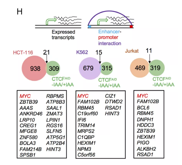 CTCF基因啟動子的染色質(zhì)可及性在CTCF耗竭時也有所增加(圖3D),這一點通過定量PCR (Q-PCR)進一步得到驗證(圖3E)。這些數(shù)據(jù)表明CTCF可以抑制自身以保持最*表達水平。對于CTCF耗竭后被下調(diào)的基因,如MYC,并沒有在啟動子區(qū)域檢測到有統(tǒng)計學意義的染色質(zhì)可及性變化。因此,當啟動子區(qū)域保持開放時,遠端增強子區(qū)域的染色質(zhì)景觀變得更難以接近,再加上CTCF耗竭,可能在控制能調(diào)控MYC轉(zhuǎn)錄的遠端增強子-啟動子loop環(huán)的形成中發(fā)揮作用。