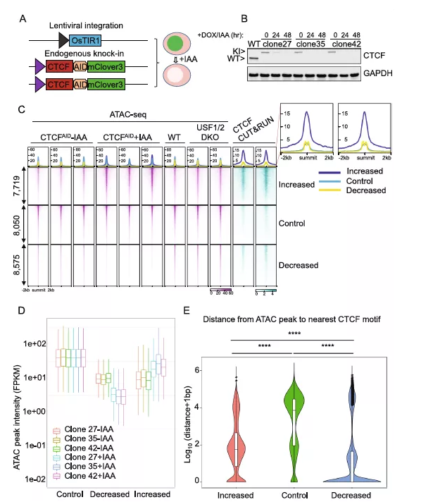 前期研究已經(jīng)通過將雙等位基因miniAID-mClover3標簽導入人的內(nèi)源性CTCF位點,并產(chǎn)生了三個CTCFAID細胞的克隆。在強力霉素和生長素(IAA)處理下,強制表達與Skp1/Culin/F-box (SCF)泛素連接酶組分連接的OsTIR1,快速降解CTCF融合蛋白(圖1A)。當強力霉素和IAA完全從培養(yǎng)基中洗脫后,這種降解是可逆的。通過對三個單細胞來源的克隆進行IAA處理24小時的免疫印跡實驗,證實了CTCF能夠有效降解(圖1B),類似于之前在48h處理條件下的研究結(jié)果。