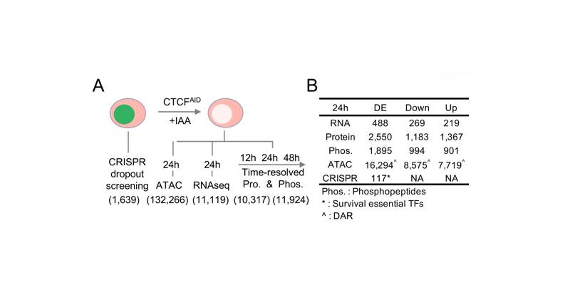 CCCTC-結(jié)合因子(CTCF)是一種高度保守的含鋅指轉(zhuǎn)錄因子,被稱為“基因組編織大師”。它是研究最廣泛的三維(3D)染色質(zhì)結(jié)構(gòu)調(diào)控因子。研究發(fā)現(xiàn)在CTCF急性衰竭細胞模型和其他基因敲除模型中,CTCF在全基因組TAD和TAD內(nèi)部loop環(huán)的形成中是不可或缺的。為了更好地理解CTCF結(jié)合占用率如何促進轉(zhuǎn)錄調(diào)控,本文系統(tǒng)地進行了多組學研究,特別關(guān)注染色質(zhì)可及性。通過系統(tǒng)整合了ATAC-seq、RNA-seq, WGBS, Hi-C, Cut&Run和CRISPR-Cas9基因篩選技術(shù),以及深度蛋白質(zhì)組學和磷酸化蛋白質(zhì)組學分析,用以研究CTCF蛋白急性耗竭對細胞的影響。