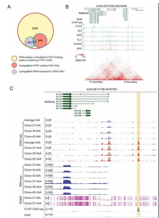 本文通過綜合分析建立了一個框架來識別假定的CTCF介導的絕緣子元件。將ATAC-seq結(jié)果中的3490個峰和有CTCF結(jié)合的峰取交集,共有716個增強的ATAC-seq峰。接下來,將它們與RNA-seq結(jié)果中上調(diào)的基因進行比對,判斷TSSs是否位于距離DARs區(qū)域2-50 kb的范圍。綜上所述,有67個基因符合這些標準(圖(Fig 4A)。這67個基因中有20個基因的附近有染色質(zhì)loop環(huán)。例如,在BLCAP基因上游約7 kb處觀察到一個假定的抑制性CTCF結(jié)合峰,該峰位于Hi-C數(shù)據(jù)所示的染色質(zhì)絕緣loop環(huán)中(圖4B )。在未經(jīng)過IAA處理的對照CTCFAID細胞中,CTCF與該motif結(jié)合導致染色質(zhì)可及性受到抑制,這在ATAC-seq數(shù)據(jù)中信號的缺失很明顯。然而,在急性CTCF耗竭時,ATAC-seq峰值信號和BLCAP mRNA表達明顯增加(圖4C)。