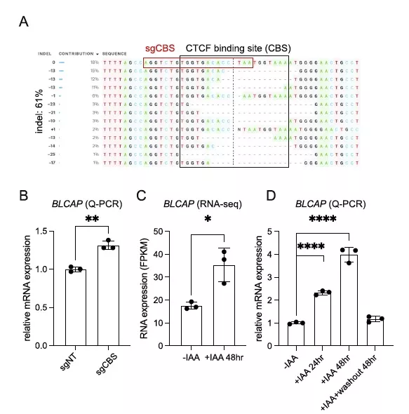 為了進一步驗證預測的假定絕緣子的作用,將慢病毒表達的引導RNA感染表達Cas9的SEM細胞中,然后進行抗生素選擇。Sanger基因組測序(Inference of CRISPR edit, ICE)在目標人群中檢測到約61%的總indel頻率(圖5A),與非靶向?qū)驅(qū)φ战M(sgNT)相比,導致BLCAP mRNA表達顯著增加(圖5B)。用IAA處理CTCFAID細胞24和48小時,然后洗脫IAA進行CTCF修復。通過RNA-seq分析和Q-PCR驗證,驗證急性CTCF蛋白耗竭時BLCAP mRNA的表達(圖5C)。不出所料,生長素處理24或48 h后CTCF蛋白急性耗竭,BLCAP表達水平顯著升高。更重要的是,洗脫生長素后,其表達水平恢復到親本細胞的水平(圖5D)。綜上所述,這些數(shù)據(jù)有力地支持了CTCF在BLCAP調(diào)控區(qū)域的占用充當了控制BLCAP表達的功能絕緣體。