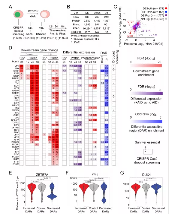 本文開發(fā)了一種多組學聯(lián)合的方法來定義CTCF共調(diào)控轉(zhuǎn)錄因子,總共鑒定了40個CTCF共同調(diào)控因子,這些TF在急性CTCF耗竭時在mRNA和/或蛋白質(zhì)水平上顯著影響其下游靶基因的表達(圖6D)。正如預期的那樣,這40個CTCF共調(diào)控因子中的大多數(shù)也在CTCF介導的DARs中有共同定位,證實了它們與CTCF有著潛在的直接共同調(diào)控作用。