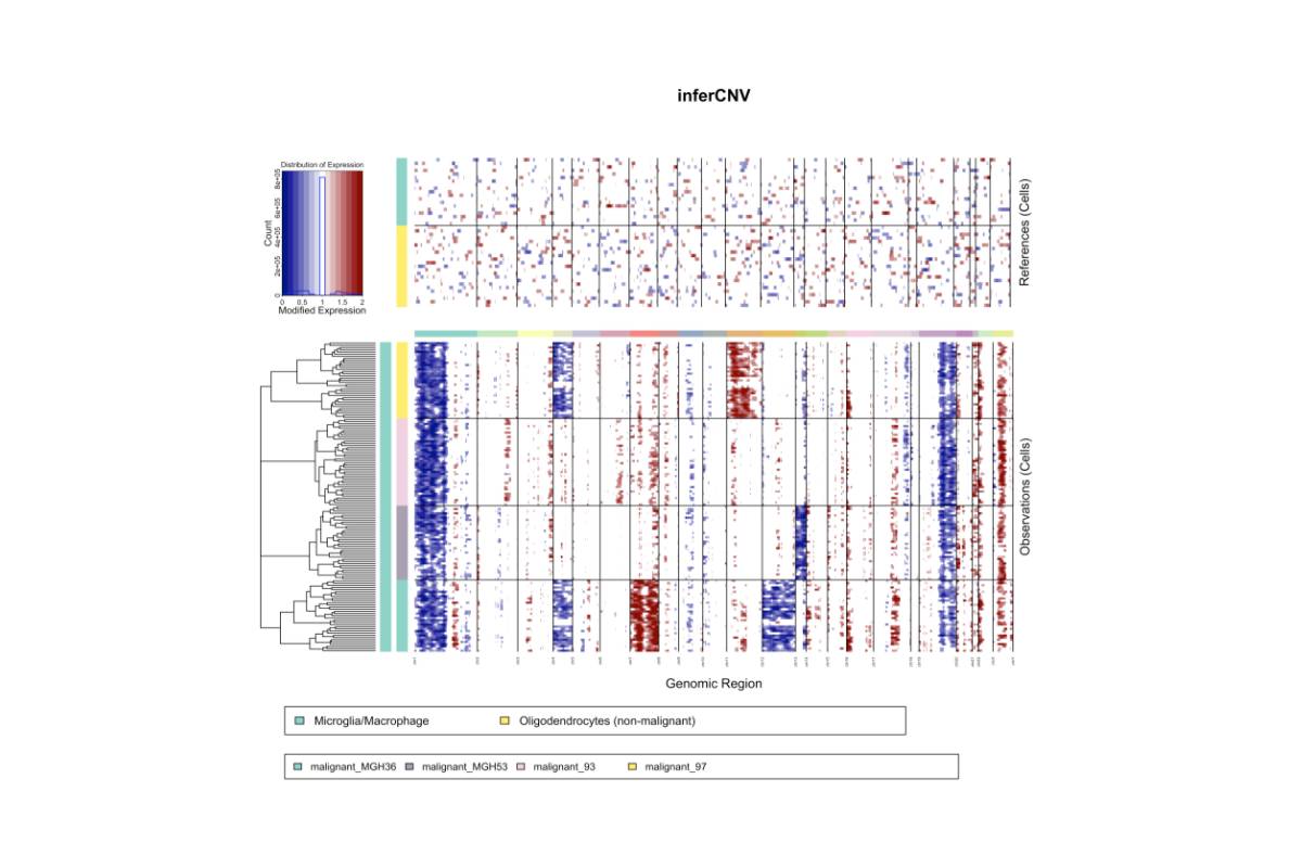 2014年發(fā)表在science(IF=47.728)上的《Single-cell RNA-seq highlights intratumoral heterogeneity in primary glioblastoma》[1],通過對基因相對表達(dá)水平來推斷每個細(xì)胞的大規(guī)??截悢?shù)變異(CNV)。該研究選擇正常人的腦組織bulk RNA-seq的數(shù)據(jù)作為對照,單細(xì)胞樣本聚為7組,無監(jiān)督分析確定了9個異常細(xì)胞,它們具有成熟少突膠質(zhì)細(xì)胞基因表達(dá)增加和膠質(zhì)母細(xì)胞瘤基因下調(diào)的特點,剩余的420個細(xì)胞中沒有一個顯示出與非惡性細(xì)胞或免疫細(xì)胞類型的轉(zhuǎn)錄程序相似的特征。雖然非惡性細(xì)胞是腫瘤微環(huán)境的關(guān)鍵組成部分,但該研究通過解離和CD45+分選后,已經(jīng)很大程度上排除了非腫瘤細(xì)胞。該研究通過infer CNV有效地將腦膠質(zhì)母細(xì)胞瘤中的正常細(xì)胞與惡性細(xì)胞區(qū)分開來。