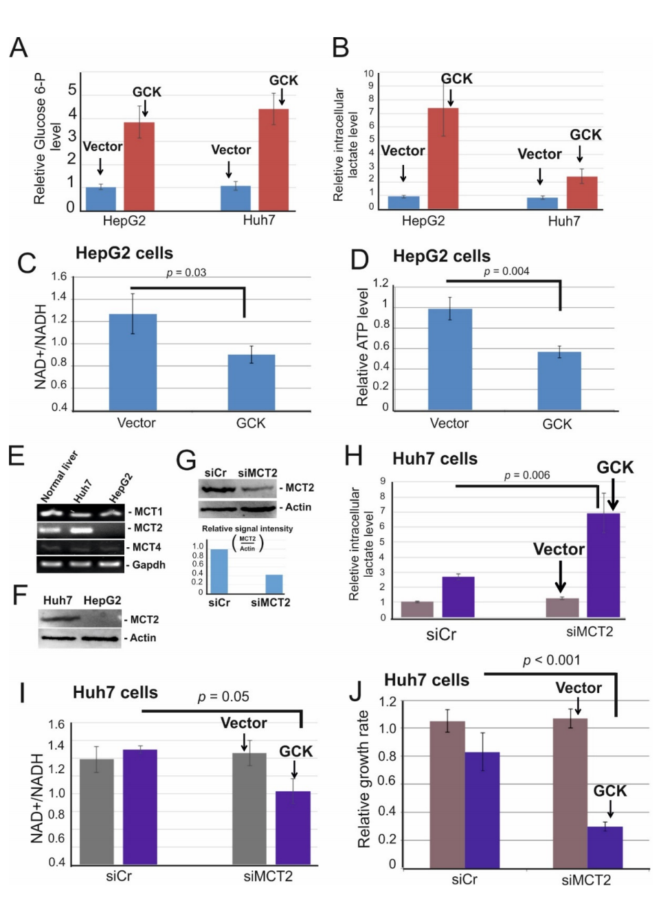 由于GCK過表達(dá)并未強(qiáng)烈誘導(dǎo)Huh7細(xì)胞中的乳酸積累,這就提出了乳酸是如何在這些細(xì)胞中外排的問題。乳酸外排由雙向單羧酸轉(zhuǎn)運(yùn)體(MCTs)介導(dǎo),已知有四種MCT可轉(zhuǎn)運(yùn)乳酸,因此檢測(cè)了在 Huh7 和 HepG2 細(xì)胞中MCT變異體的表達(dá)。有趣的是,HepG2細(xì)胞僅表達(dá)MCT1和MCT4,而Huh7 細(xì)胞表達(dá)了三種變異體(圖4E)。還通過免疫印跡雜交實(shí)驗(yàn)證實(shí)了HepG2 細(xì)胞中缺乏 MCT2的表達(dá)(圖4F)。這些數(shù)據(jù)提出了隨后的問題,即細(xì)胞內(nèi)乳酸積累是否由于HepG2細(xì)胞中缺乏MCT2所致。為了檢驗(yàn)這種可能性,耗盡了GCK過表達(dá)的Huh7細(xì)胞中的MCT2(圖4G) 并檢測(cè)了細(xì)胞內(nèi)乳酸的濃度。事實(shí)上,MCT2 的消耗顯著誘導(dǎo)了乳酸的積累(圖4H)。因此,在MCT2耗盡的細(xì)胞中,NAD+/NADH 比率顯著下降(圖4I) 并伴隨細(xì)胞增殖的減少(圖4J)??傊@些數(shù)據(jù)表明MCT2的缺乏在GCK過表達(dá)的細(xì)胞中顯著積累了乳酸。